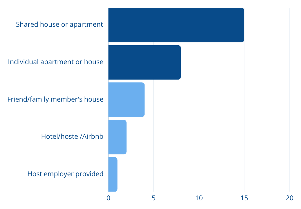 There are a variety of housing types available in the U.S. including short-term rentals like hotels or Airbnbs, or longer-term accommodation like apartments or houses that you can rent on your own or share with roommates. Of the 31 respondents to our survey, 50% rent a room in a shared house or apartment while 26.7% signed a lease for their own accommodation.