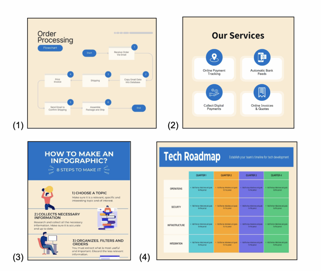 - Use visual tools like (1) flowcharts for processes, (2) universal symbols and icons, (3) infographics for complex information, and (4) color coding for important information.