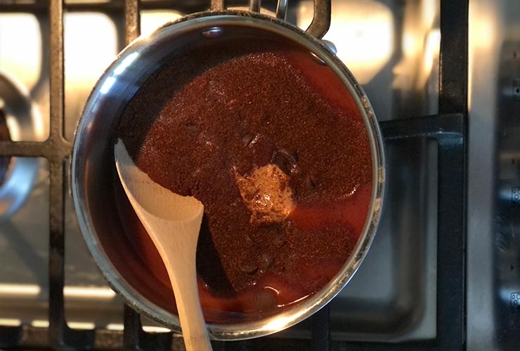 If serving mole sauce with enchiladas, prepare this sauce while enchiladas are baking in the oven. Combine all ingredients in a medium sized saucepan over medium heat. Stir often until peanut butter and chocolate chips smooth out, making sure it does not stick to the bottom.