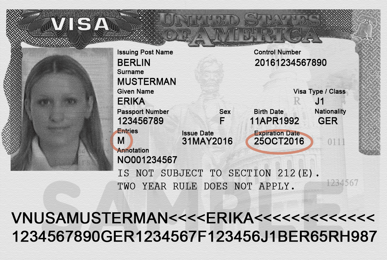 - Entries. Under this heading, there will either be the number “1” or the letter “M.” If your visa has the number “1,” it is a Single Entry Visa. This means you can only enter the United States one time on this visa. If your visa has the letter “M,” it is a Multiple Entry Visa and it allows you to enter the U.S. several times. You could, for example, go to Canada during a weekend off and re-enter the United States. You should not plan on leaving and re-entering the United States during the 30-day travel period.