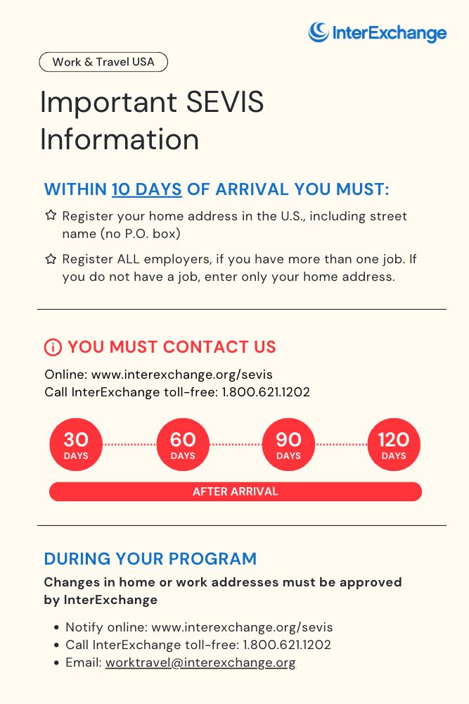 Students must register their information with InterExchange (via SEVIS or by phone 1.800.621.1202) upon arrival in U.S. and at least once every 30 days thereafter, even if their information has not changed.